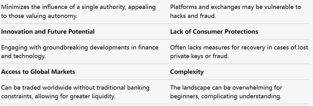 Investing in cryptocurrencies comes with its own set of advantages and disadvantages. Understanding these can help beginners make informed decisions.