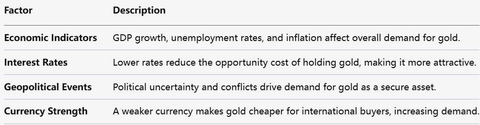 Economic Indicators: GDP growth, unemployment rates, and inflation impact demand for gold.