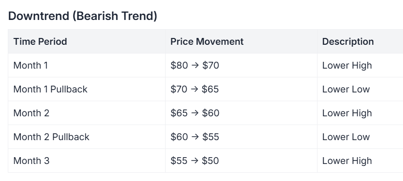 Downtrend (Bearish Trend): Characterized by a series of "lower highs" and "lower lows." The price is consistently falling to new troughs, and the rallies are not exceeding previous highs. A trendline can be drawn by connecting the falling highs.