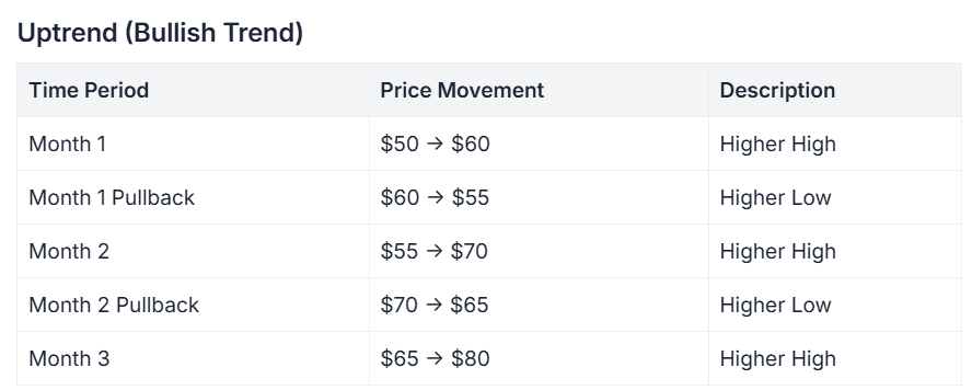 Uptrend (Bullish Trend): Characterized by a series of "higher highs" and "higher lows." The price is consistently reaching new peaks and the pullbacks are not falling below previous lows. You can draw a "trendline" by connecting the rising lows to visualize the uptrend.