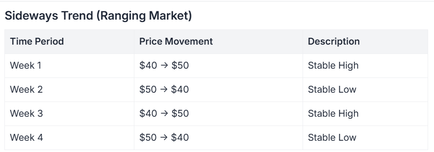 Sideways Trend (Ranging Market): Occurs when the price moves back and forth between a relatively stable high and low, without a clear upward or downward direction. This indicates a period of consolidation or indecision.