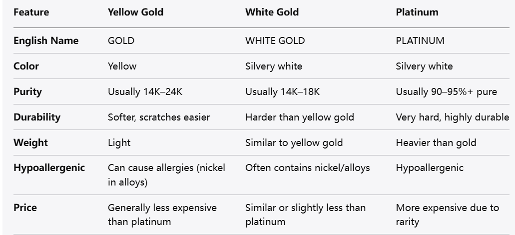 When comparing platinum to gold and white gold, it is essential to understand the distinctions and relationships among these precious metals. Each metal has its own characteristics and market dynamics that influence pricing.