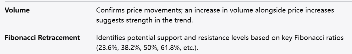 Fibonacci Retracement: Identifies potential support and resistance levels based on Fibonacci ratios.
