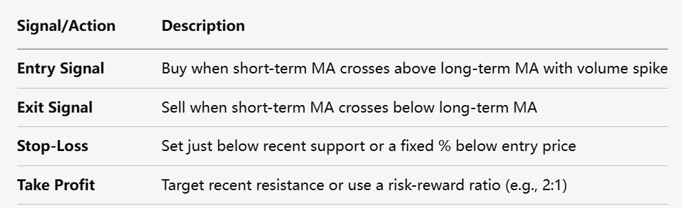 Entry Signal: Buy when the short-term moving average crosses above the longer-term moving average, especially if accompanied by increased volume.