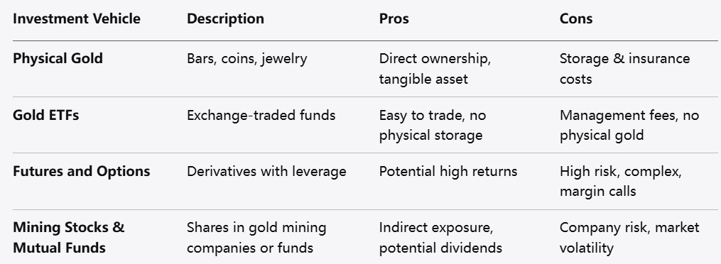 Mining Stocks and Mutual Funds: Indirect exposure to gold prices with company-specific risks.