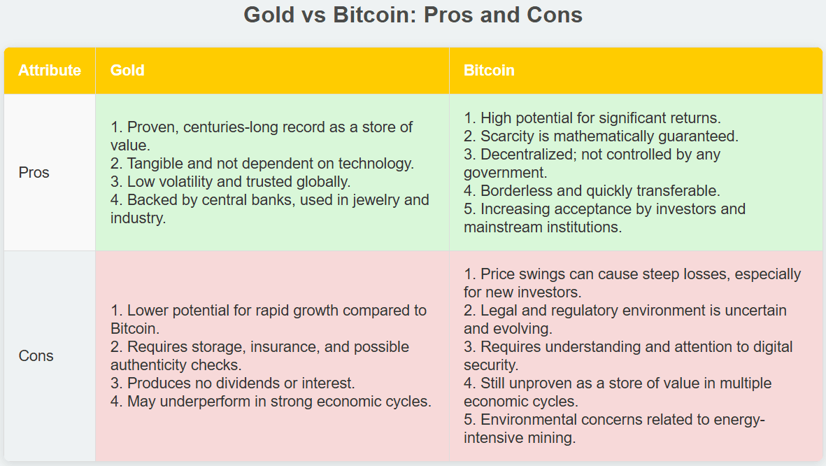 Choosing between gold and Bitcoin as a beginner comes down to your personal preferences, investment goals, and comfort with risk.
