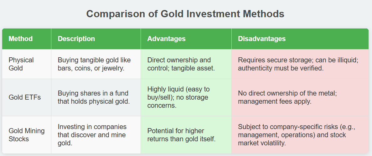 Gold ETFs: Exchange-traded funds allow you to own shares in funds that hold gold. ETFs are highly liquid, can be traded like stocks, and remove the need for storage. However, you don’t hold the metal directly.