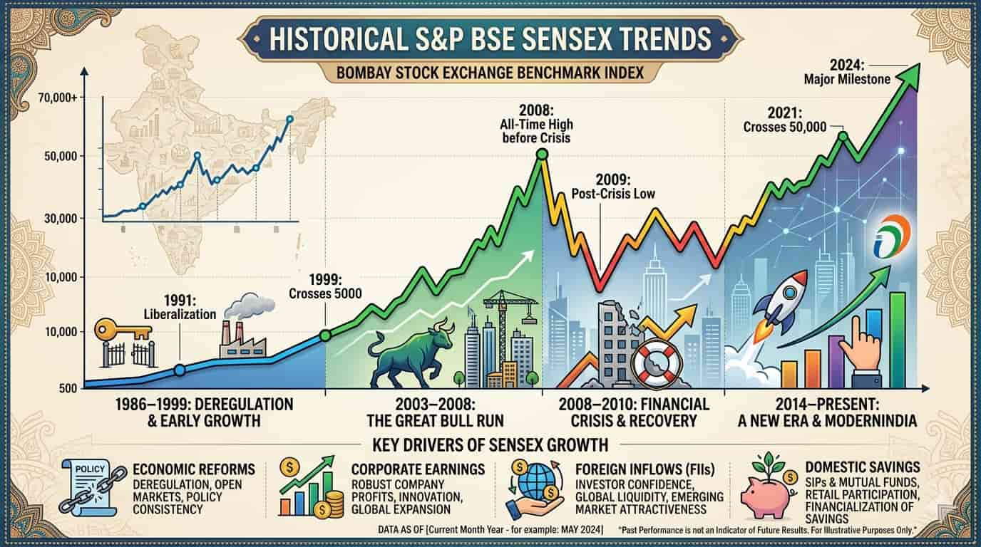Recent Trends: In the years leading to 2021, the Sensex reached unprecedented highs, driven by recovery from the pandemic and increasing foreign portfolio investment.