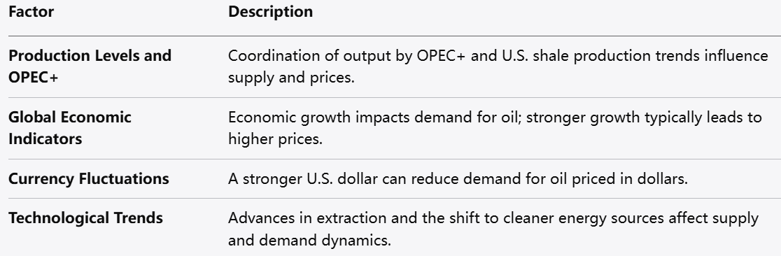 A: Prices are influenced by supply-demand balance, production decisions by OPEC+, U.S. shale output, geopolitical events, global economic indicators, and inventory reports.